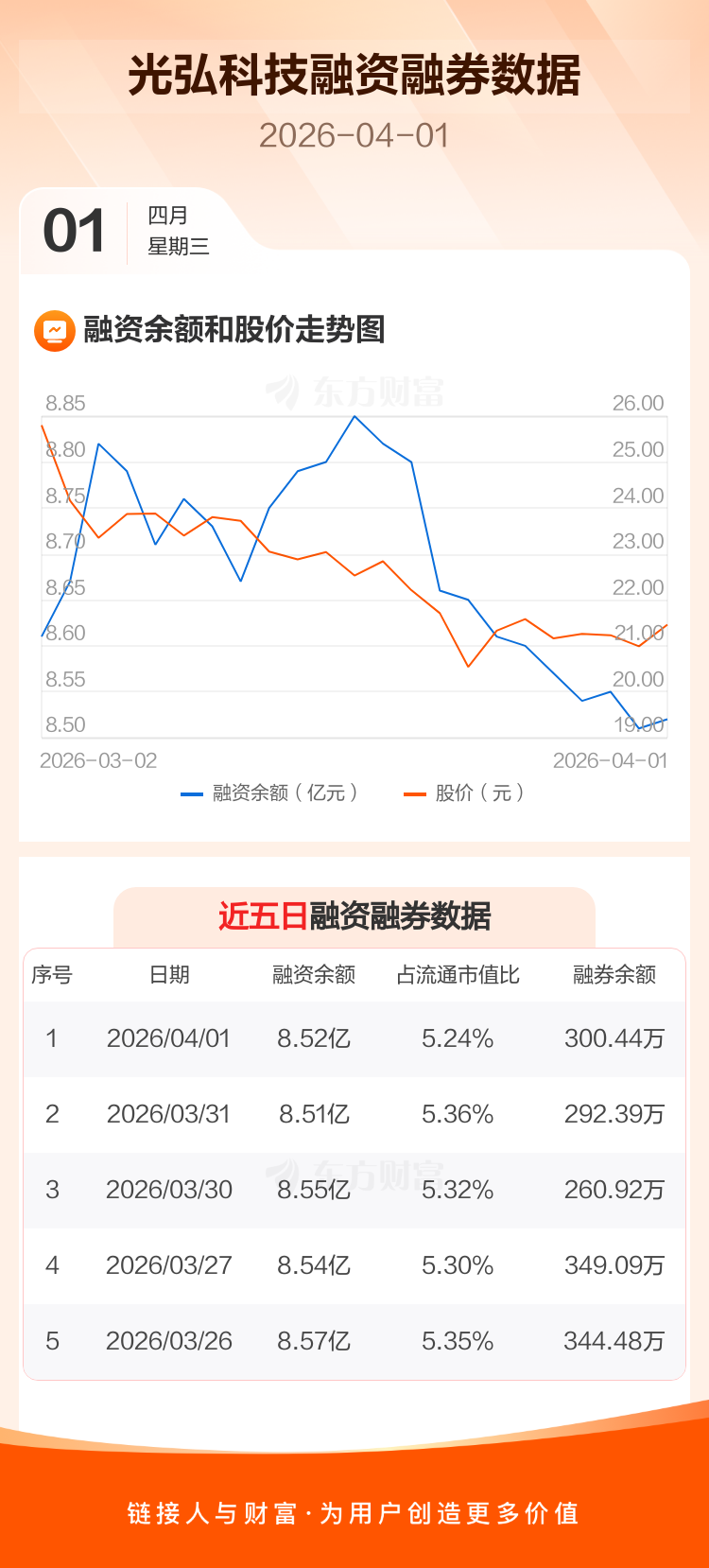 交易所最新数据显示,光弘科技于2026年4月1日获融资买入1310.95万元,融资偿还1280.53万元,当日融资净买入30.43万元。目前,该股融资余额8.52亿,占流通市值比例为5.24%。