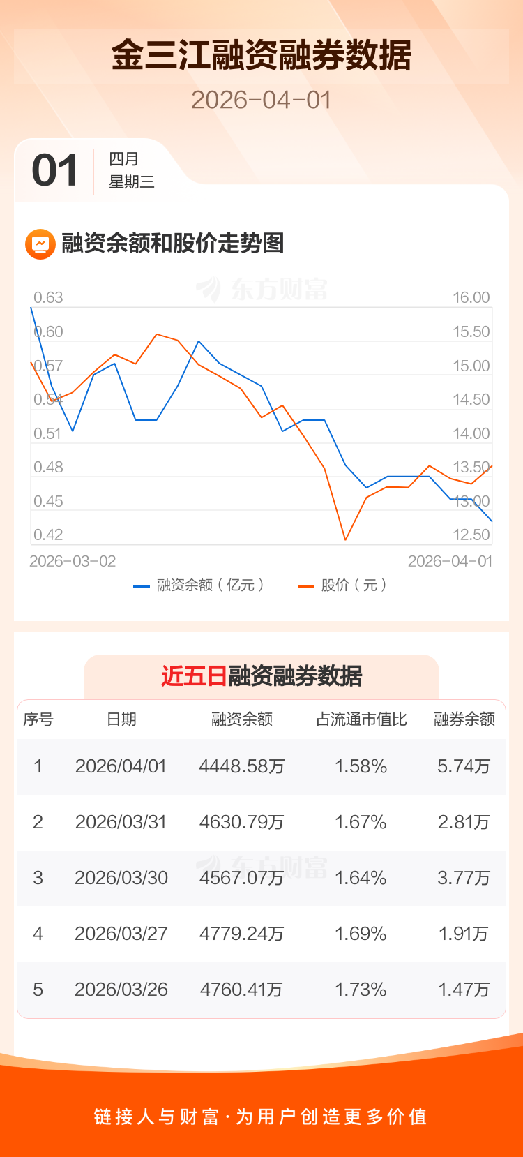交易所最新数据显示,金三江于2026年4月1日获融资买入230.52万元,融资偿还412.73万元,当日融资净偿还182.2万元。目前,该股融资余额4448.58万,占流通市值比例为1.58%。