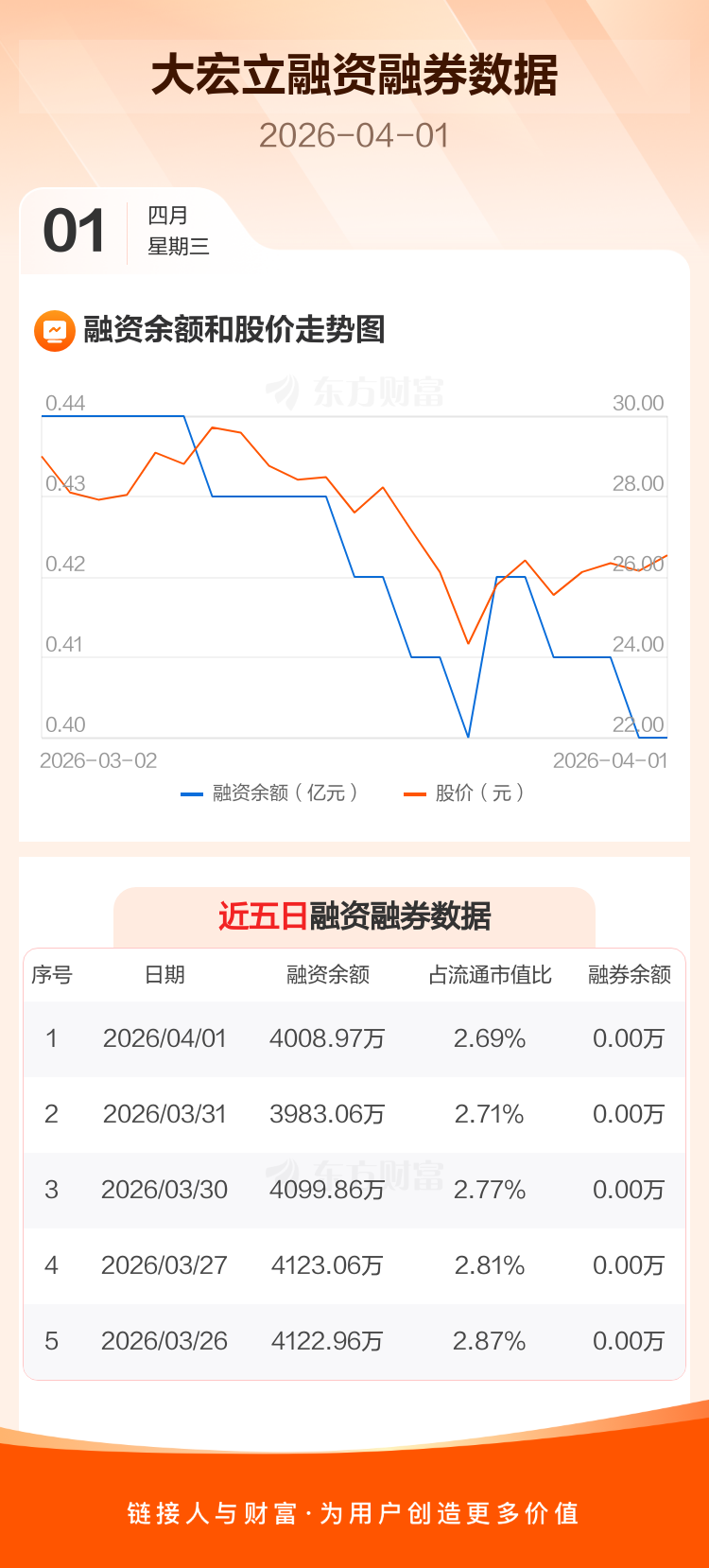 交易所最新数据显示,大宏立于2026年4月1日获融资买入323.79万元,融资偿还297.88万元,当日融资净买入25.91万元。目前,该股融资余额4008.97万,占流通市值比例为2.69%。