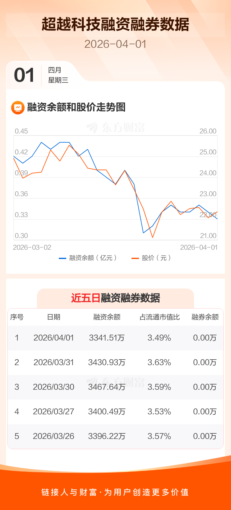 交易所最新数据显示,超越科技于2026年4月1日获融资买入205.74万元,融资偿还295.17万元,当日融资净偿还89.43万元。目前,该股融资余额3341.51万,占流通市值比例为3.49%。