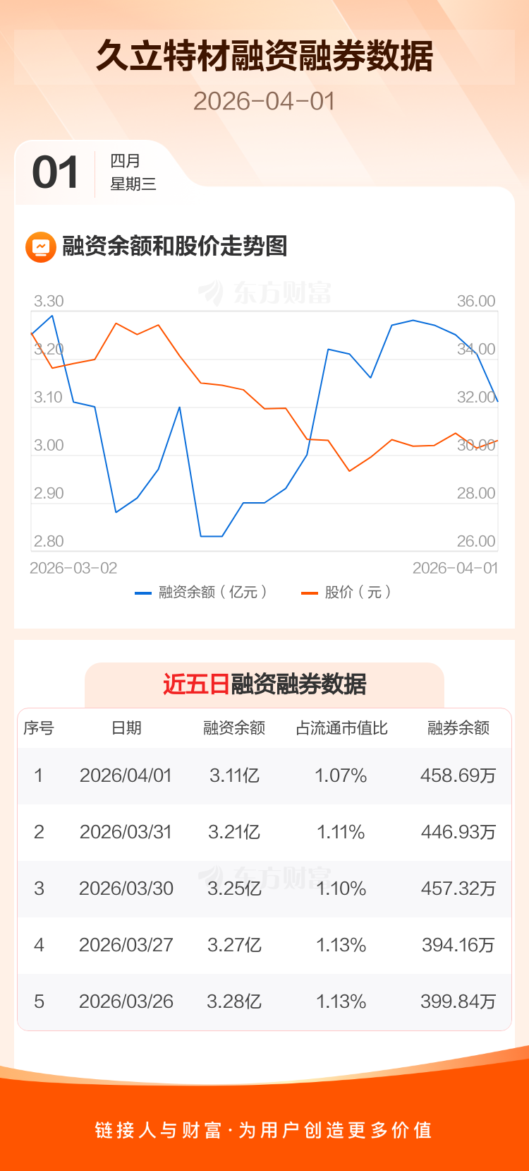 交易所最新数据显示,久立特材于2026年4月1日获融资买入1132.28万元,融资偿还2096.33万元,当日融资净偿还964.05万元。目前,该股融资余额3.11亿,占流通市值比例为1.07%。