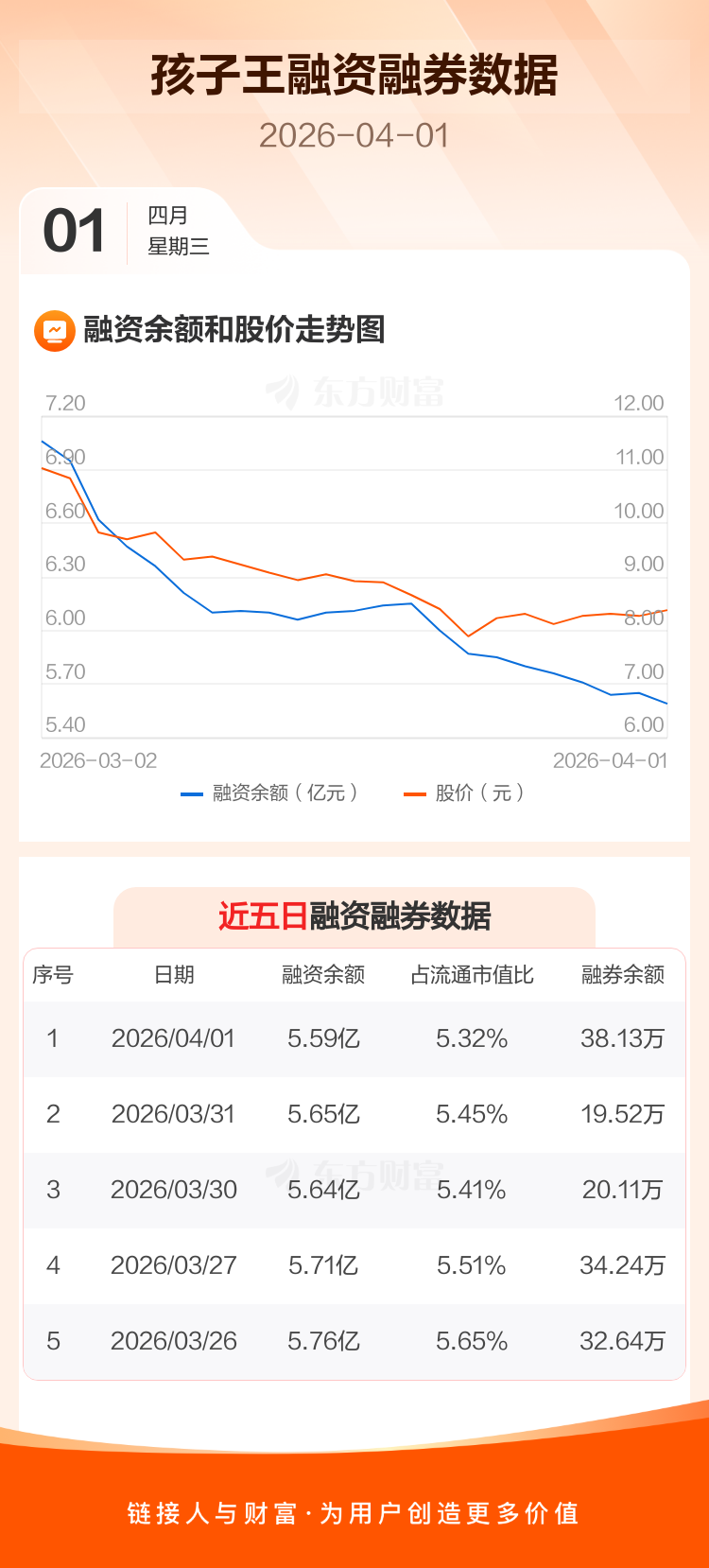 交易所最新数据显示,孩子王于2026年4月1日获融资买入752.22万元,融资偿还1327.76万元,当日融资净偿还575.54万元。目前,该股融资余额5.59亿,占流通市值比例为5.32%。