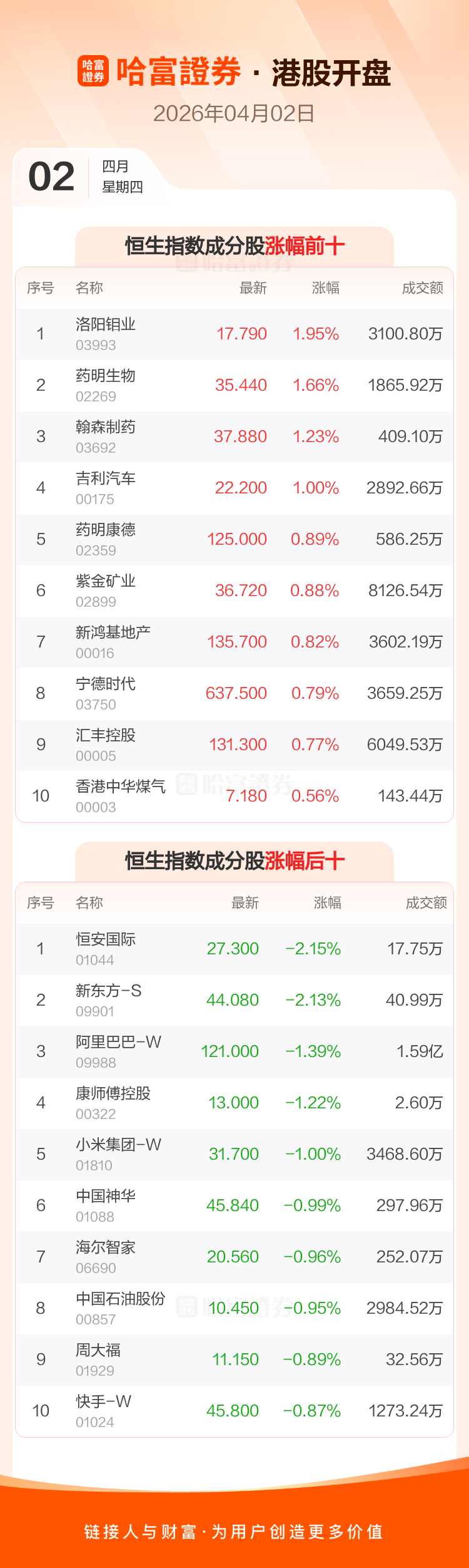 港股4月2日低开 ,恒生指数开盘报25254.49点,跌39.54点,跌幅0.16%;恒生科技指数开盘报4732.95点,跌23.5点,跌幅0.49%。恒生指数成分股中洛阳钼业、药明生物、翰森制药涨幅居前,恒安国际、新东方-S、阿里巴巴-W跌幅靠前。恒生科技指数成分股中零跑汽车、小鹏集团-W涨幅居前,哔哩哔哩-W、阿里巴巴-W、金山软件跌幅靠前。