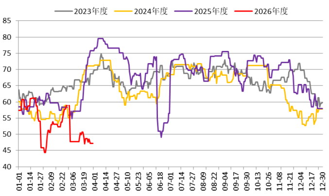 受中东地区能源化工设施遇袭、霍尔木兹海峡航运受阻等因素影响,当前海外甲醇装置开工率处于历史极低水平。截至3月30日,海外甲醇装置开工率为47.2%,与近5年的均值69.8%相比下降了22.6个百分点。