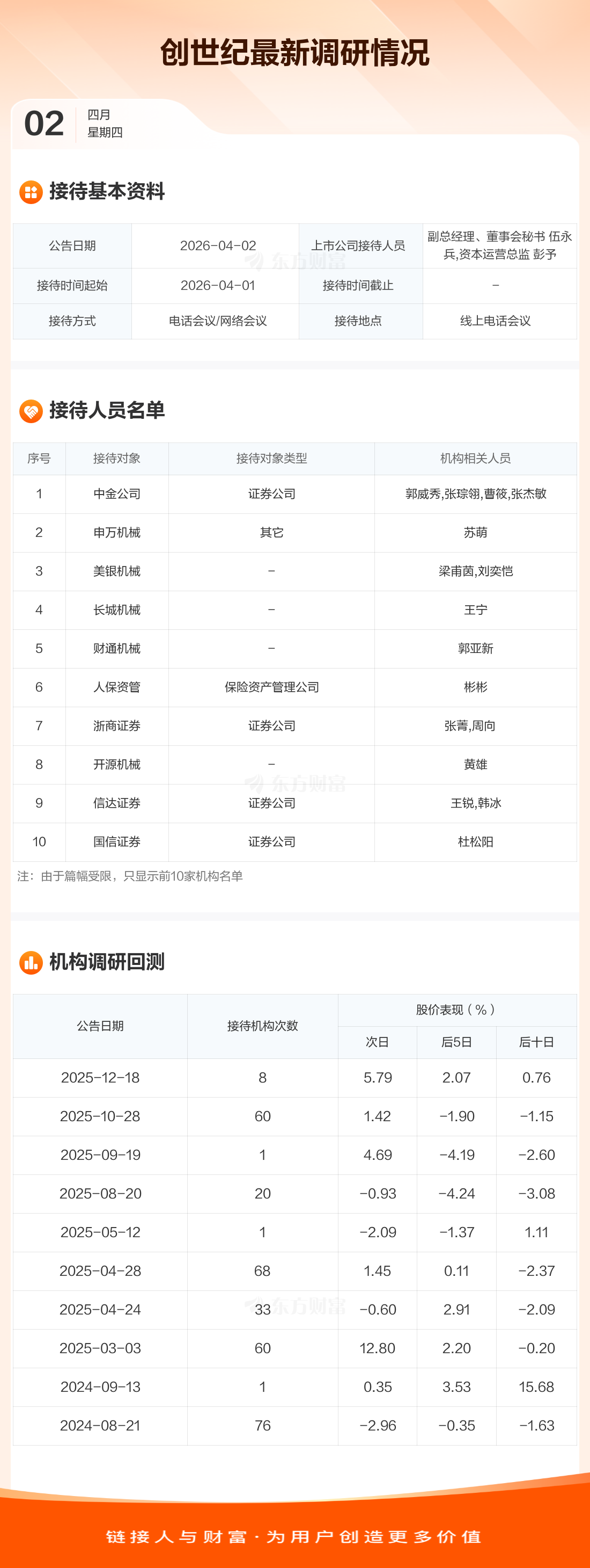 创世纪4月2日公告称,4月1日接待中金公司等42家机构调研。接待人员包括副总经理、董事会秘书 伍永兵,资本运营总监 彭予。