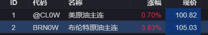 消息方面,国际油价扭转跌势,直线拉升,截至发稿,布伦特原油期货涨近4%,报每桶105.03美元,WTI原油现报100.82美元/桶。