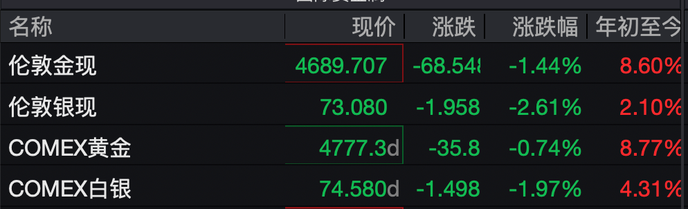 截至发稿,现货黄金跌1.44%,报4689.707美元/盎司;COMEX黄金期货跌0.74%,报4777.3美元/盎司。4月1日,现货黄金收涨1.9%,报4758美元,此前,全球金价已连续四日上涨。