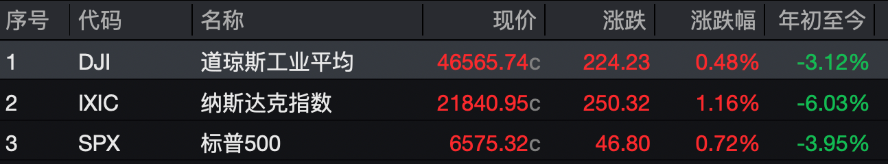 与此同时,受中东局势缓和的预期提振影响,美股三大指数集体收涨,已是连续第二个交易日上涨。截至收盘,道指涨0.48%,报46565.74点;纳指涨1.16%,报21840.95点;标普500指数涨0.72%,报6575.32点。