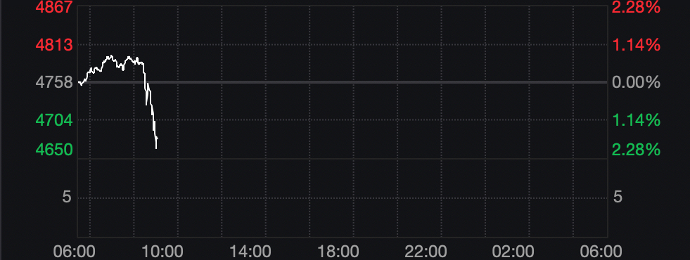 现货黄金价格四连涨后,周四早盘继续上冲,一度突破4800美元/盎司,但随后出现跳水。