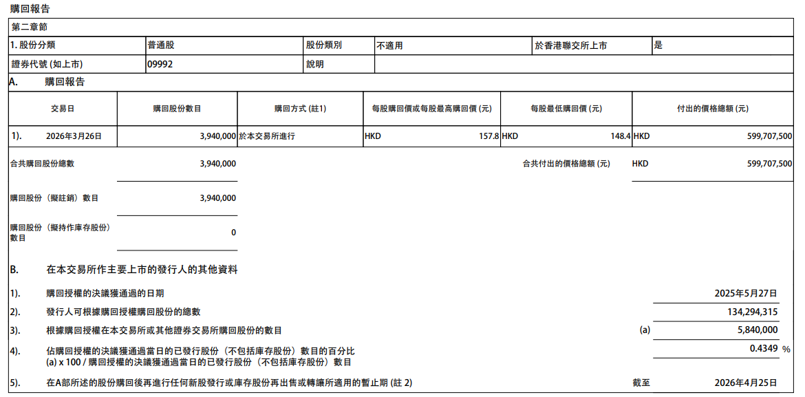 泡泡玛特在港交所公告,于2026年3月26日回购394万股,耗资约6亿港元。