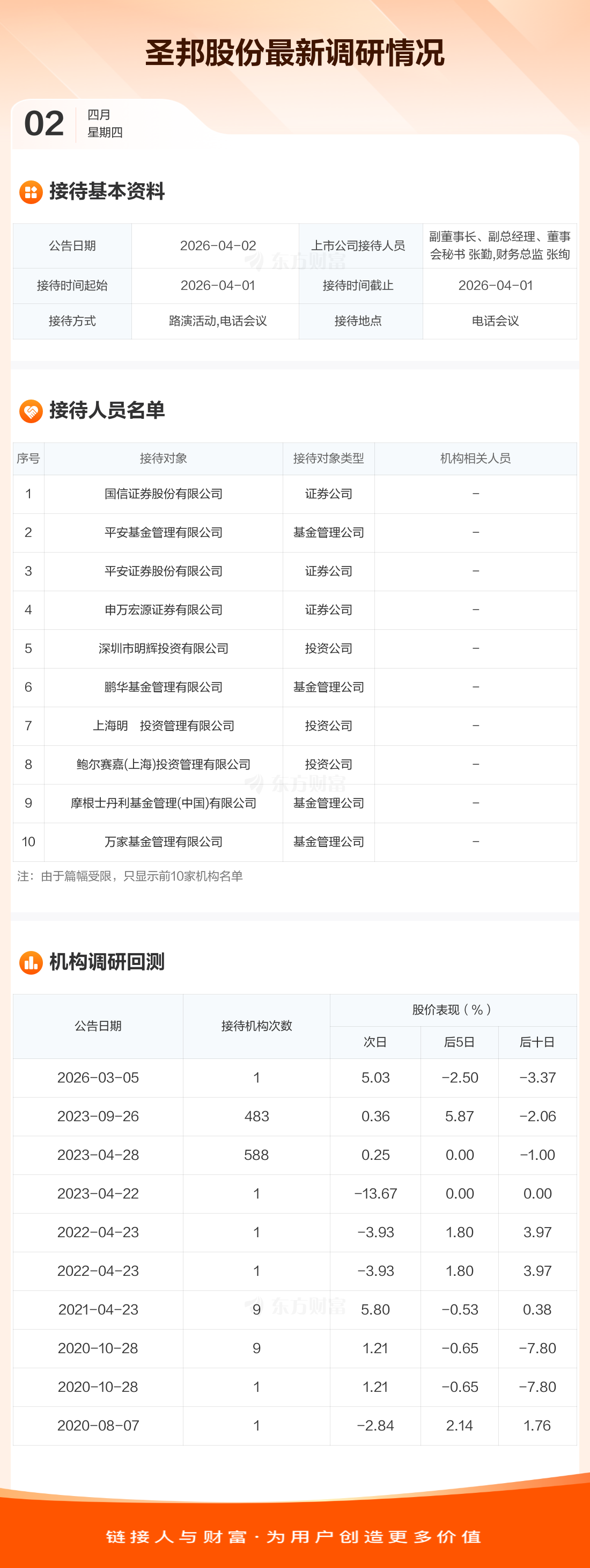 圣邦股份4月2日公告称,4月1日接待国信证券股份有限公司等203家机构调研。接待人员包括副董事长、副总经理、董事会秘书 张勤,财务总监 张绚。