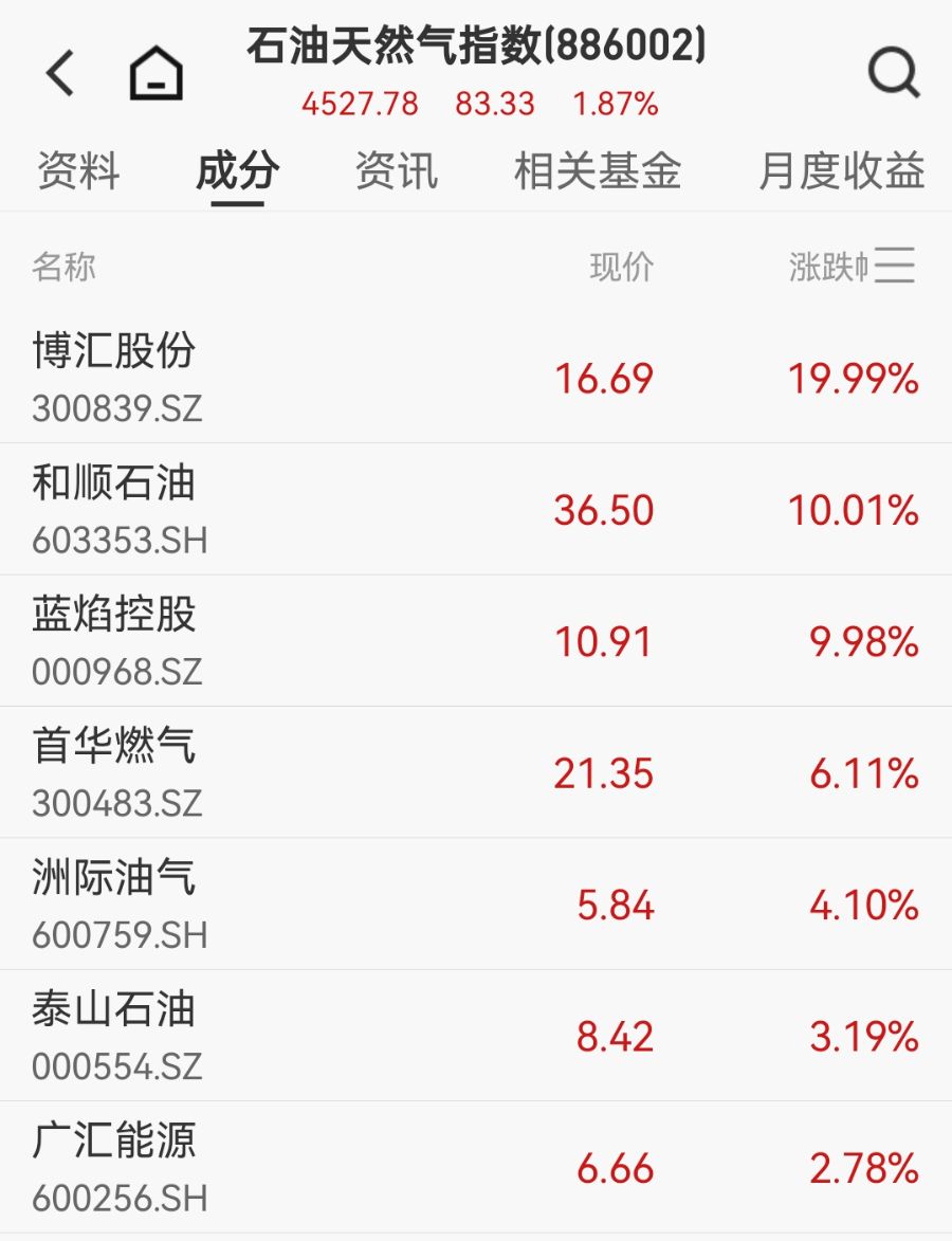 油气板块方面,博汇股份、和顺石油、蓝焰控股涨停。