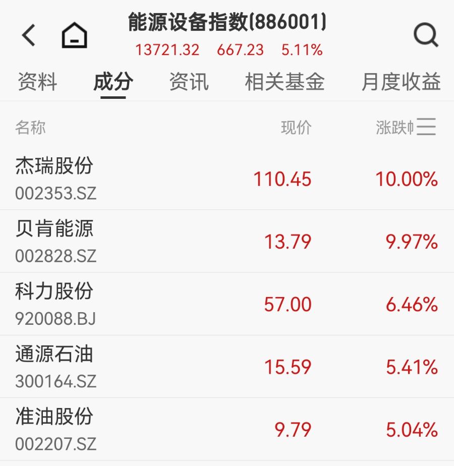 能源设备板块方面,杰瑞股份、贝肯能源涨停,科力股份、通源石油等涨超5%。