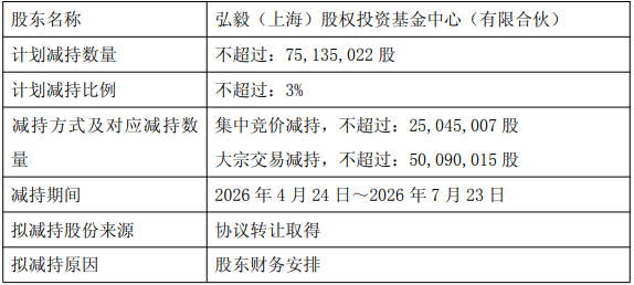 弘毅(上海)股权投资基金中心(有限合伙)计划自本公告披露之日起15个交易日后的3个月内,通过集中竞价交易、大宗交易等方式,减持其持有的公司股份不超过75,135,022股,减持比例不超过公司股份总数的3%。