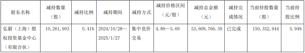 2025年2月6日,公司于2025年1月27日收盘后收到公司股东弘毅(上海)股权投资基金中心(有限合伙)发来的《减持公司股份进展告知函》,弘毅(上海)股权投资基金中心(有限合伙)自2024年10月28日至2025年1月27日通过集中竞价交易方式减持公司股份10,261,903股,占公司总股本的比例0.41%。截至该公告披露日,该次减持计划披露的减持时间区间届满,减持计划结束。