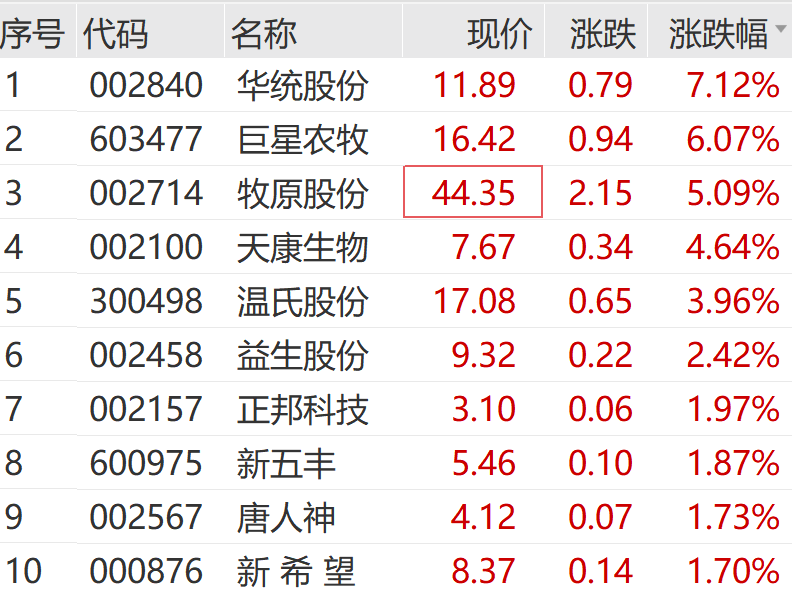 4月2日上午,A股农林牧渔板块盘中拉升,鸡产业、猪产业方向走强。华统股份涨超7%,巨星农牧、牧原股份、温氏股份等纷纷走强。