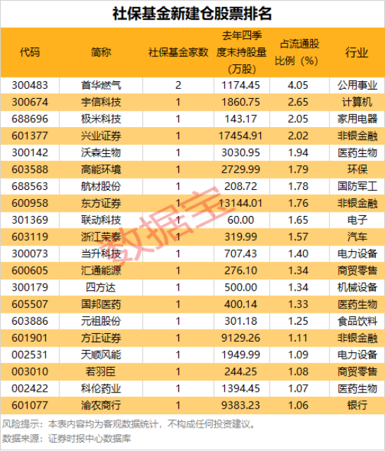 从持股比例看,新进股中社保基金持有比例最多的是首华燃气,持股量占流通股比例为4.05%;其次是宇信科技,社保基金持股比例为2.65%;持股比例居前的还有极米科技、兴业证券、沃森生物等。