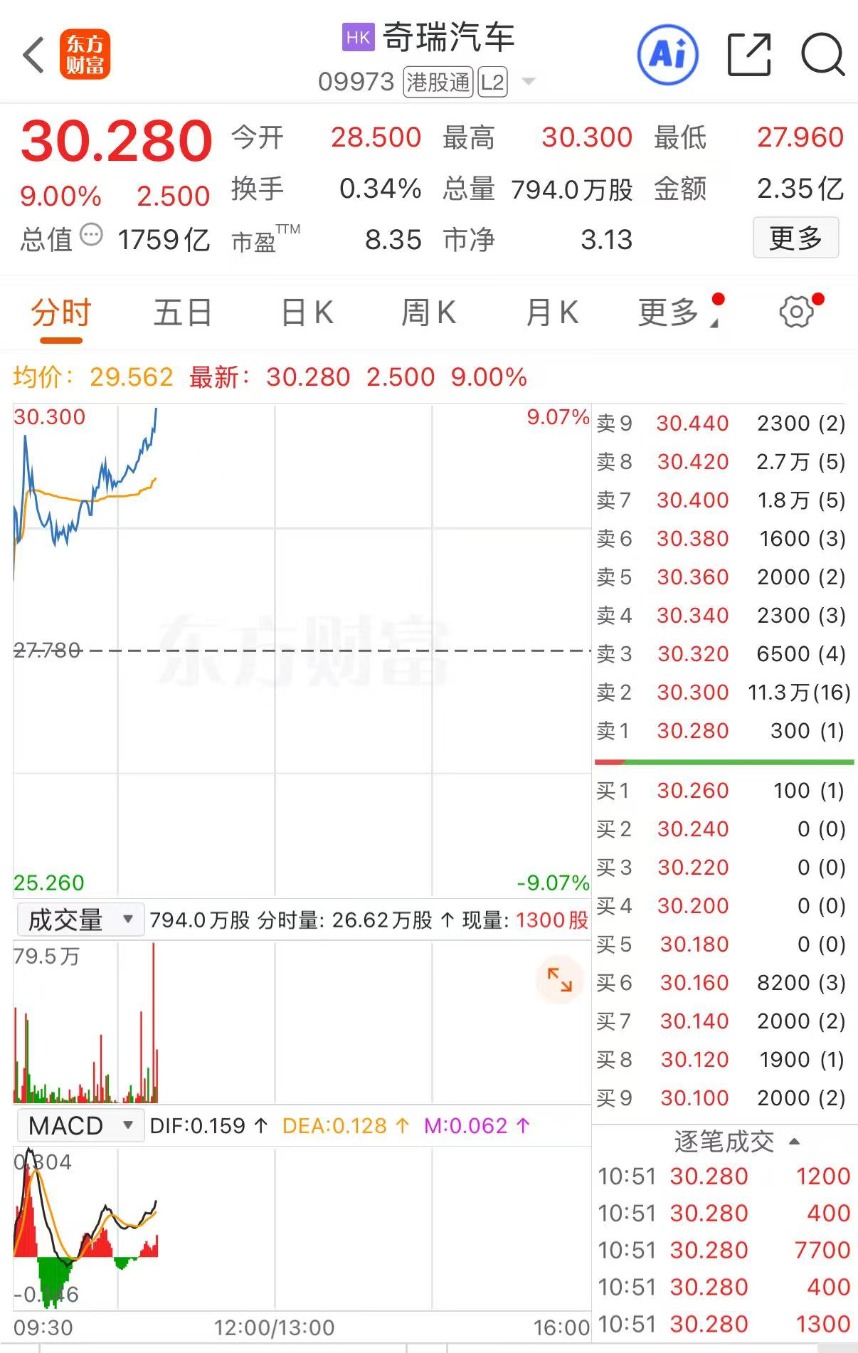 港股异动 | 奇瑞汽车盘中涨超9% 3月汽车销量22.8万辆