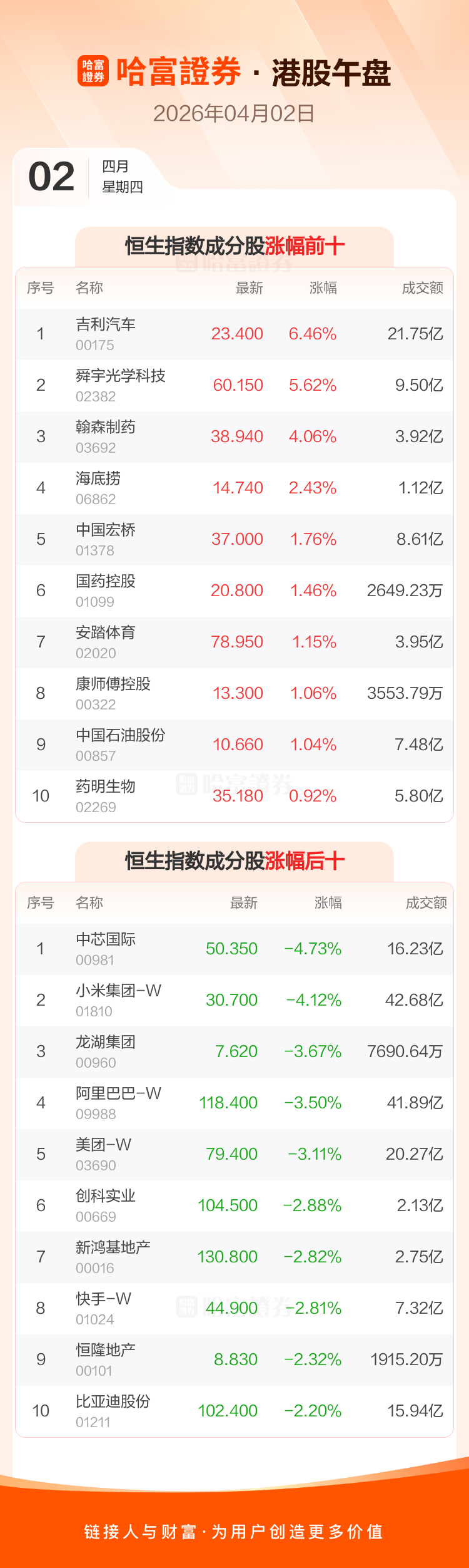港股4月2日午盘走低,恒生指数收报25017.23点,跌276.8点,跌幅1.09%;恒生科技指数收报4651.57点,跌104.88点,跌幅2.21%。恒生指数成分股中吉利汽车、舜宇光学科技、翰森制药涨幅居前,中芯国际、小米集团-W、龙湖集团跌幅靠前。恒生科技指数成分股中舜宇光学科技、零跑汽车、蔚来-SW涨幅居前,华虹半导体、中芯国际、小米集团-W跌幅靠前。