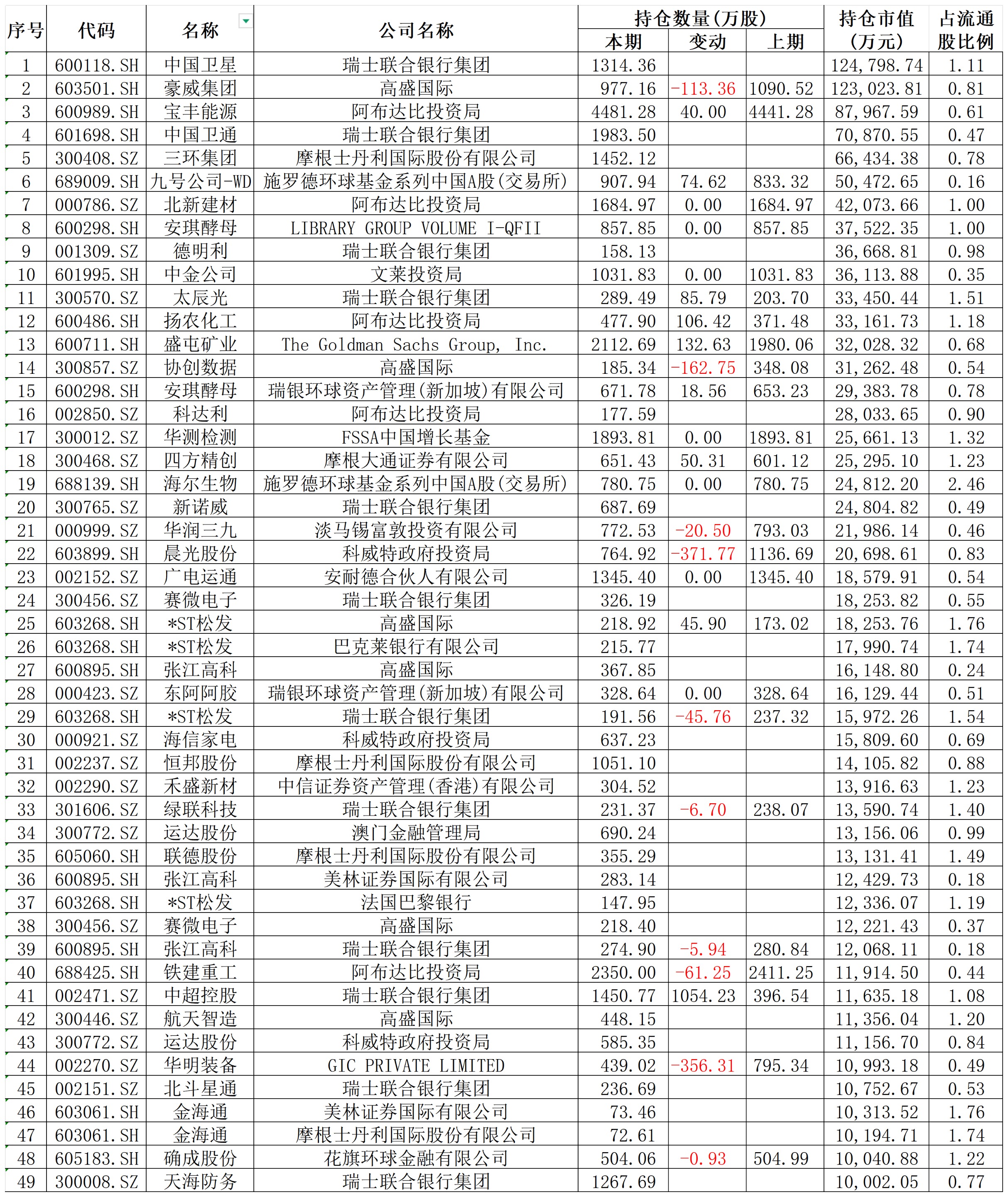 从持仓市值来看,瑞士联合银行集团在去年四季度持有1314.36万股中国卫星(600118.SH),新进前十大流通股东,持仓市值达到了12.48亿元,排在第一位。
