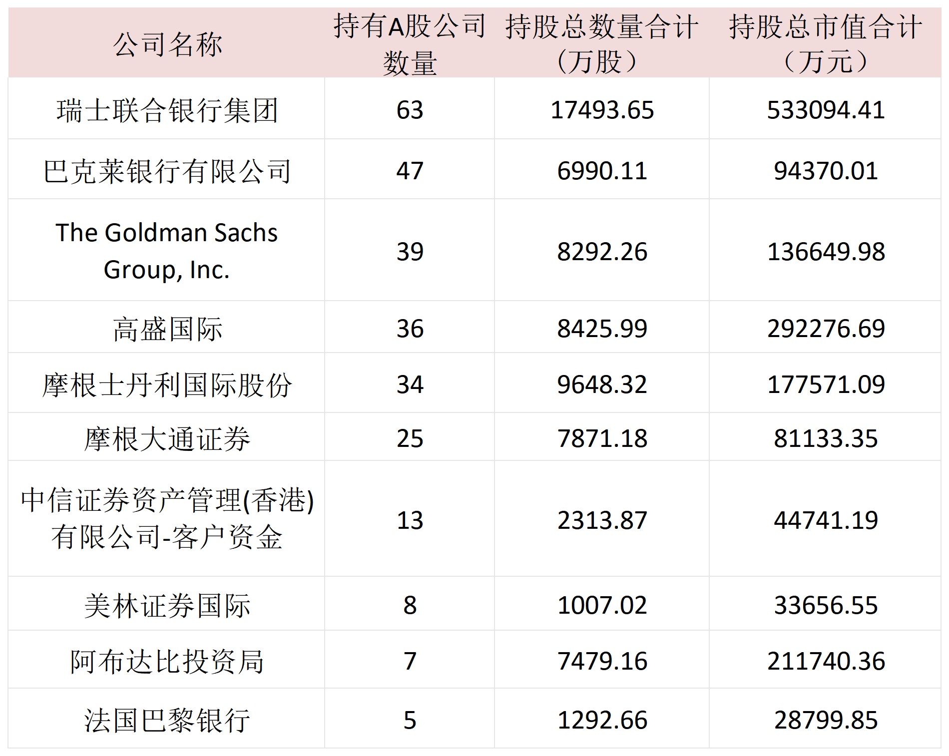 从持有A股数量排名来看,瑞士联合银行现身63家A股公司的前十大流通股东名单,总市值合计为53.31亿元。巴克莱银行持有47家A股公司的股份,总市值约为9.44亿元。高盛集团位列39家A股的前十大流通股东,总市值为13.67亿元。