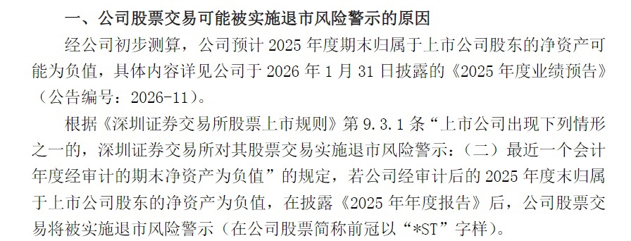 4月1日盘后,深康佳A发布公告称,经公司初步测算,预计2025年度期末归属于上市公司股东的净资产可能为负值。若公司2025年度经审计的期末归属于上市公司股东的净资产为负值,根据《深圳证券交易所股票上市规则》第9.3.1条相关规定,公司股票交易将在披露2025年年度报告后被实施退市风险警示(股票简称前冠以“*ST”字样)。公司2025年年度报告审计工作仍在进行中,最终财务数据以正式披露的经审计后的《2025年年度报告》为准。公司将在披露2025年年报前至少再披露一次风险提示公告,并将严格按照相关规定及时履行信息披露义务。