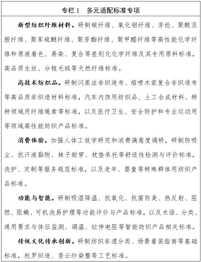 (一)提升标准供需适配性。适应需求多元化发展趋势,研制新型纺织纤维材料标准、棉毛麻丝等天然纤维高值化利用标准和高技术纺织品标准,不断拓展纺织纤维材料应用领域。研制舒适消费体验、功能与智能、质量分级等标准,推进适老宜小、宠物专用等产品标准制修订,满足不同群体的消费需求。加快推进纺织非物质文化遗产、国潮文化产品等标准研制,助推传统文化传承创新。制修订化学纤维机械、针织机械、染整机械、非织造机械等纺织机械标准,满足纺织设备升级改造需求。