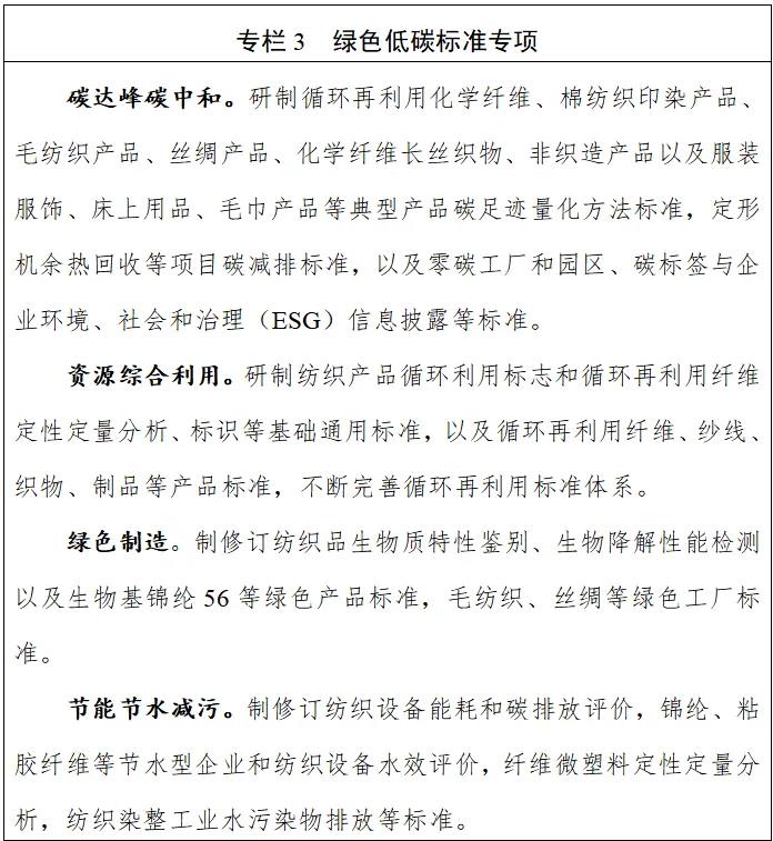 (三)推进绿色低碳发展。聚焦低碳工艺技术和装备,以标准引领绿色制造、绿色产品开发。开展短流程纺纱、少水染色等工艺技术标准预研。重点研制典型纺织产品碳足迹核算规则标准和废旧纺织品循环利用标准,加快生物基、可降解纤维材料和可持续纺织品等绿色产品标准制定,持续推进绿色工厂、绿色工业园区标准制修订。