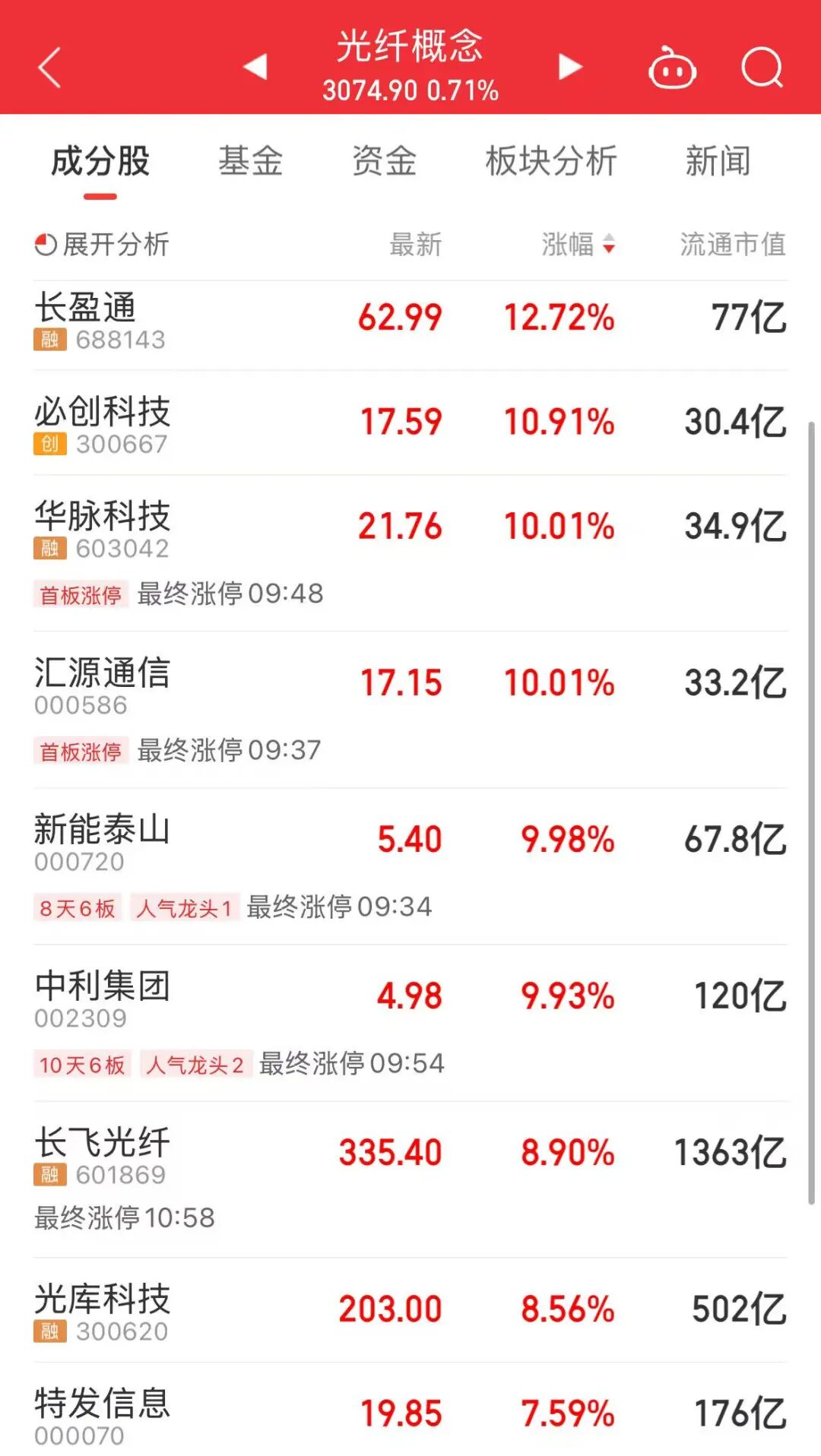 盘面上,还有两个市场热点。一是光纤两大龙头股长飞光纤、亨通光电上午大涨,股价均创历史新高。