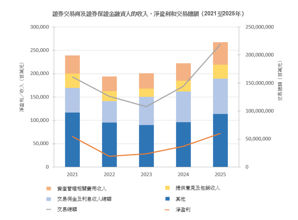 3月31日,香港证券及期货事务监察委员会(以下简称“香港证监会”)发布了2025年度《证券业财务回顾》。根据报告,2025年,香港证券经纪行业财务表现强劲,净盈利总额较2024年的444亿港元增长62%至717亿港元,创下近五年新高,交易总额较2024年的144.1万亿港元增长52%至219万亿港元,打破2021年创下的阶段性纪录。
