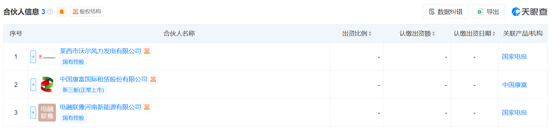合伙人信息显示,该企业由莱西市沃尔风力发电有限公司、中国康富国际租赁股份有限公司、电融联豫河南新能源有限公司共同出资。其中,莱西市沃尔风力发电有限公司为电融联豫河南新能源有限公司全资子公司。