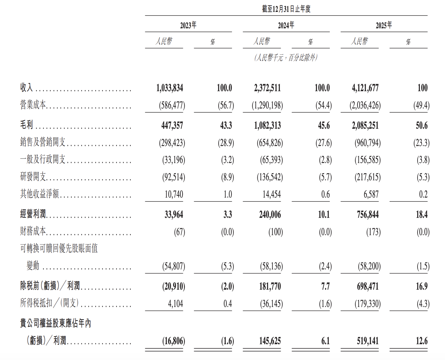 财务表现上,2023年~2025年,米连科技的收入分别为10.34亿元、23.73亿元及41.22亿元;公司毛利分别为4.47亿元、10.82亿元及20.85亿元,同期的毛利率分别为43.3%、45.6%及50.6%。