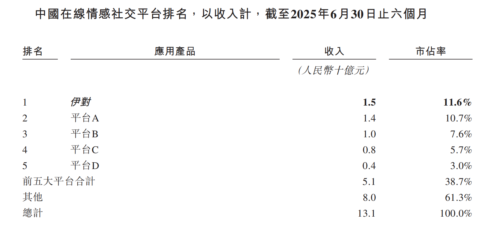截至2025年6月30日止六个月,伊对以15亿元收入位列中国在线情感社交市场第一,不过,截至2025年6月30日,其平均月活跃用户为4.8百万人,远低于排名前两位的竞争对手(平台B为30.0百万人、平台A为11.0百万人)。