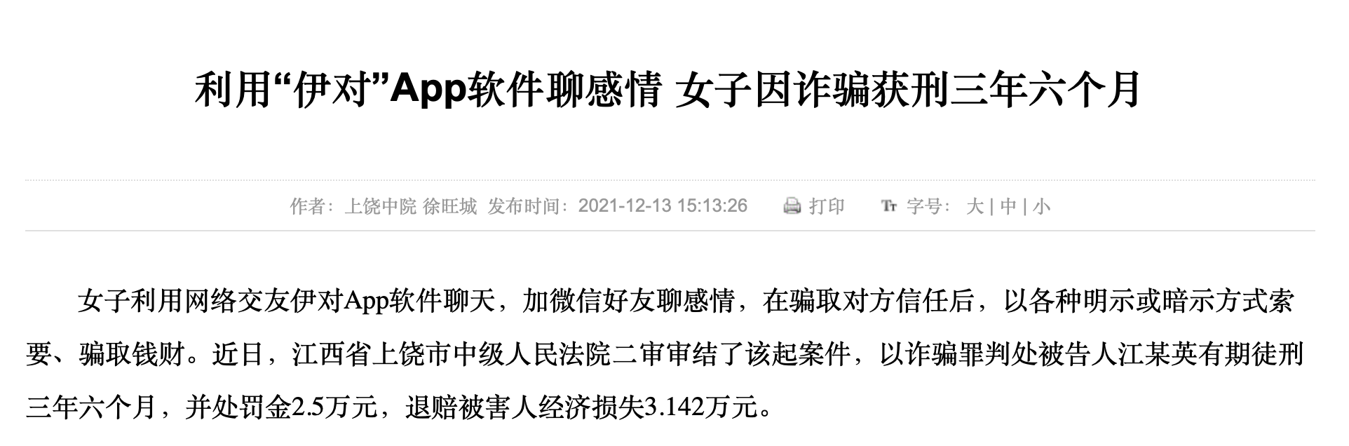 上饶中院2021年披露的一则刑事案件显示,女子利用网络交友伊对App软件聊天,加微信好友聊感情,在骗取对方信任后,以各种明示或暗示方式索要、骗取钱财。近日,江西省上饶市中级人民法院二审审结了该起案件,以诈骗罪判处被告人江某英有期徒刑三年六个月,并处罚金2.5万元,退赔被害人经济损失3.142万元。