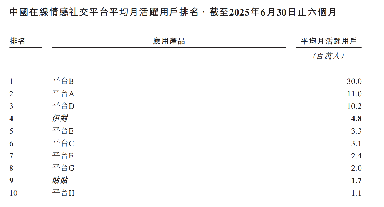 截至2025年6月30日止六个月,伊对和贴贴的平均月活跃用户分别为4.8百万人和1.7百万人,在中国在线情感社交平台中分别排名第四和第九。
