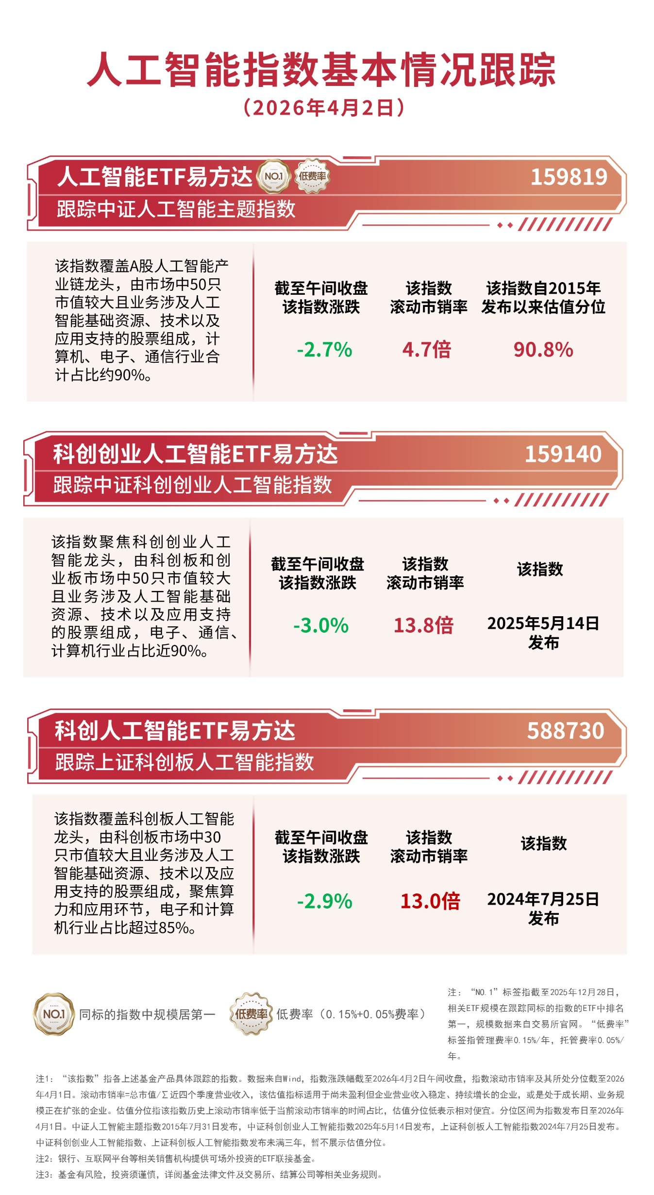 截至午间收盘,中证人工智能主题指数下跌2.7%,上证科创板人工智能指数下跌2.9%,中证科创创业人工智能指数下跌3.0%,资金逆势布局,人工智能ETF易方达(159819,联接A/C:012733/012734)半日净申购达2400万份。