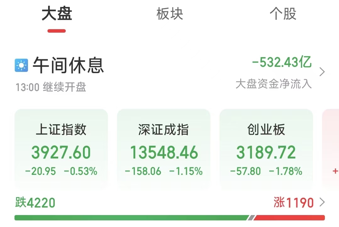 周四(4月2日),三大股指震荡整理,板块轮动加速。截至上午收盘,上证指数跌幅为0.53%,报3927.6点;深证成指和创业板指跌幅分别为1.15%和1.78%;沪深两市合计成交额11867.04亿元,总体来看,两市个股跌多涨少,共有1190只个股实现上涨。