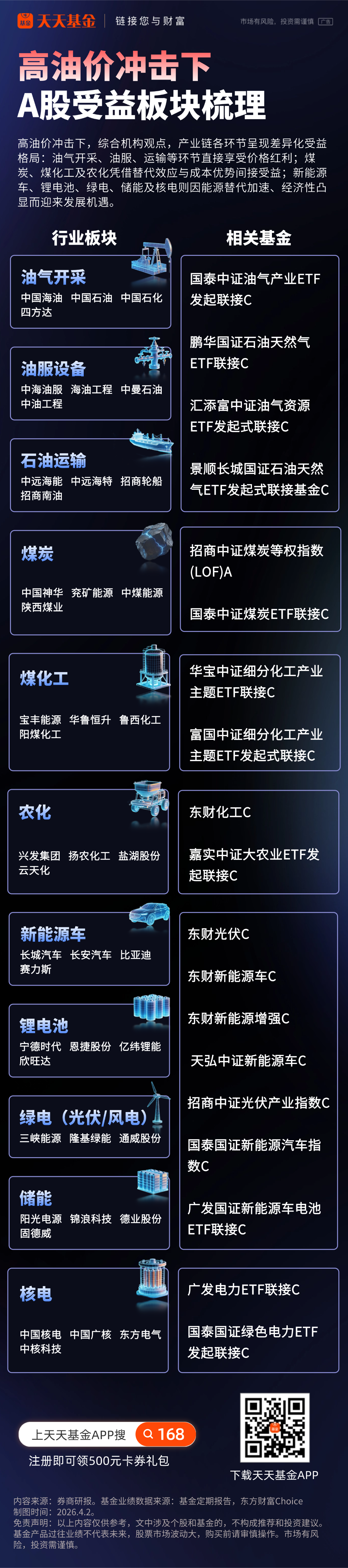 华福证券指出,油价上涨背景下,这四大类板块或将受益:一是直接受益于油价上涨的油气开采、油服工程板块;二是受益于替代效应的煤炭、煤化工、新能源板块;三是顺价能力强的化工中上游原料行业;四是具有抗通胀属性的公用事业、黄金等板块。