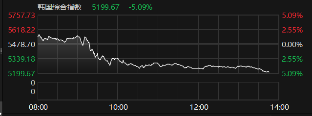 上证报中国证券网讯 4月2日,韩国综合指数盘中跌超5%。截至北京时间13时46分,该指数跌5.09%。