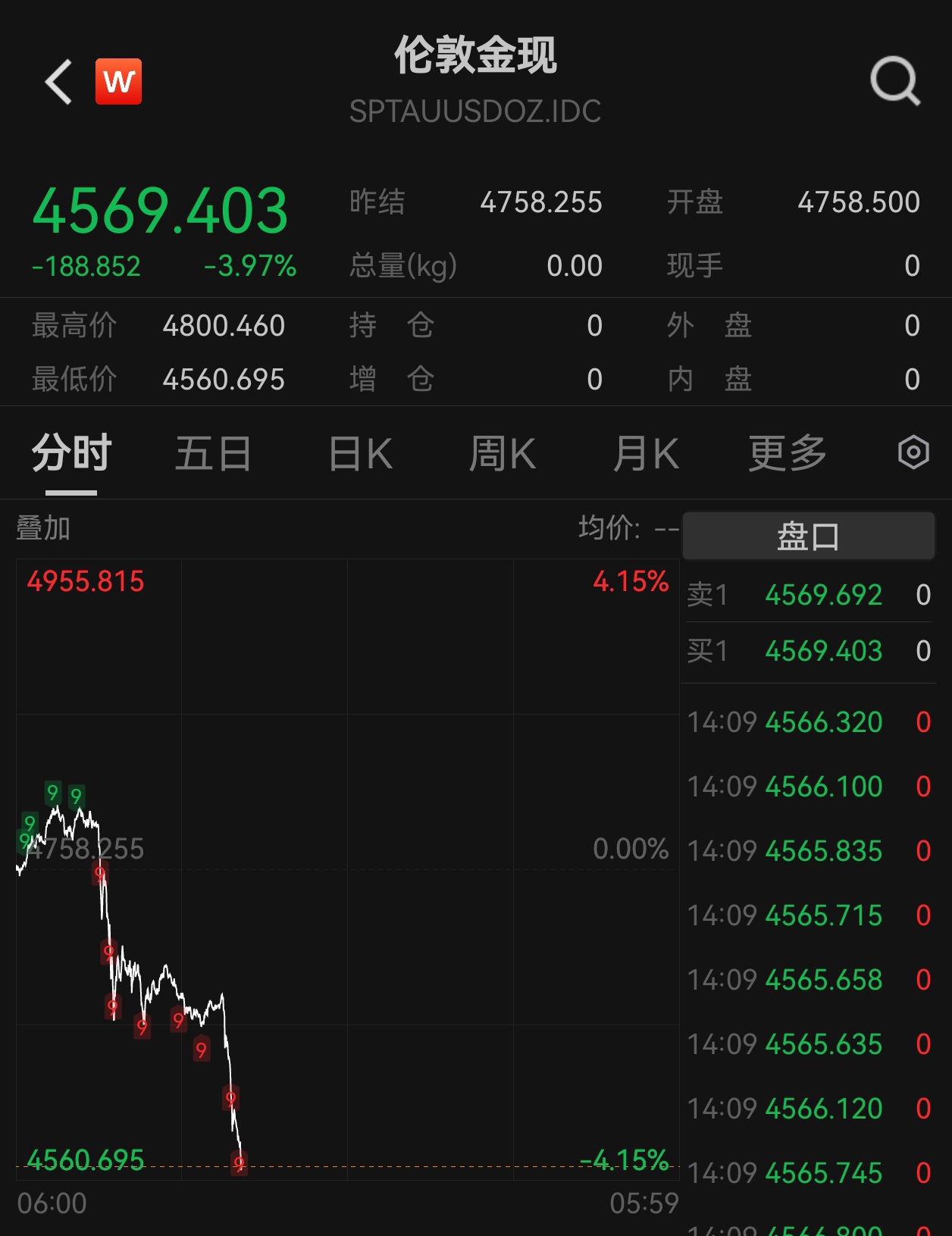 中新网4月2日电 4月2日,黄金、白银盘中再次跳水。截至发稿,伦敦现货黄金失守4600美元/盎司,最大跌幅4.31%;COMEX黄金跌近4600美元关口,最大跌幅4.17%。伦敦现货白银跌破70美元,最大跌幅7.27%。
