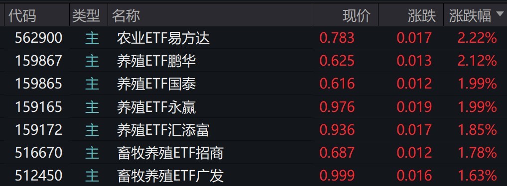 受盘面影响,农业、养殖相关ETF涨约2%。