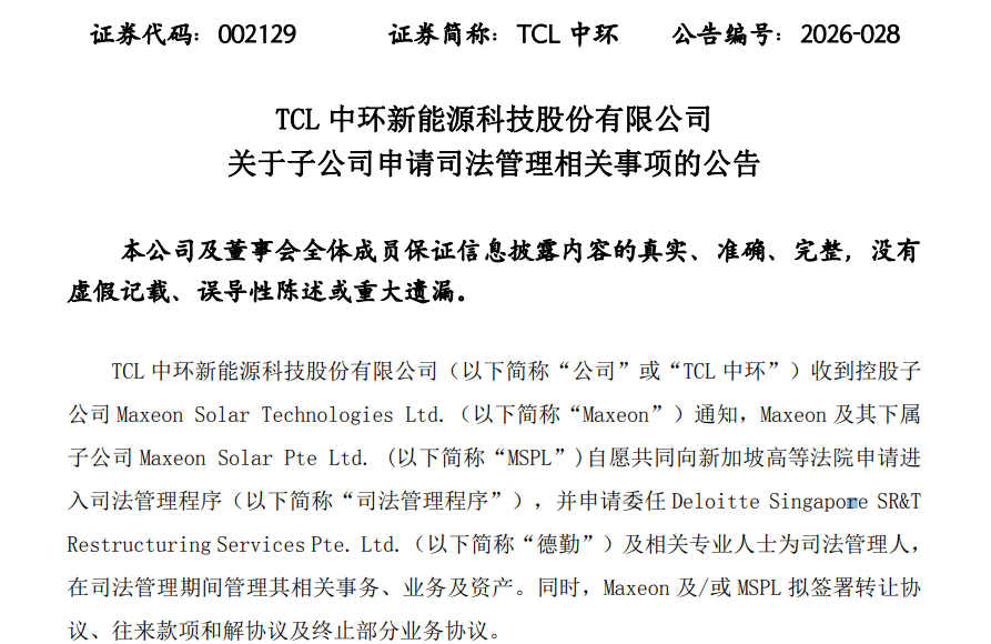 根据TCL中环公告,Maxeon及其下属子公司Maxeon Solar Pte Ltd.(MSPL)自愿共同向新加坡高等法院申请进入司法管理程序,并申请委任德勤及相关专业人士为司法管理人。
