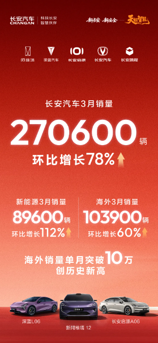 4月1日,重庆长安汽车股份有限公司(简称:长安汽车)公布最新销量成绩:3月销量达270600辆,环比增长78%,展现出新央企的增长韧性和发展势能。其中,新能源和海外市场双线告捷——当月新能源销量89600辆,环比增长高达112%;海外销量103900辆,环比增长60%,创历史新高——双双成为拉动增长的强劲引擎。