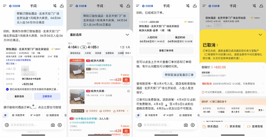 千问APP深度接入飞猪,AI订旅行的体验日益提升,用户的旅行探索、预订和售后服务更加丰富和专业。目前,一批新功能正在逐步开放测试体验,用户可以通过对话在千问APP内便捷选择酒店房型、一键付款,还能让千问修改已经生成的订单、帮忙退订、查询退款进度等。