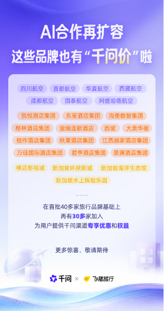 与千问和飞猪达成AI合作的旅行品牌迅速扩充。一个多月前,千问和飞猪宣布与包括中国东方航空、中国南方航空、万达酒店及度假村、上海迪士尼度假区等在内的40多个旅行品牌达成AI合作。两波累计超80家合作品牌将为千问用户提供包括折扣价、立减券、酒店早餐及延迟退房等在内的优惠或权益,单件商品最高立减300元。