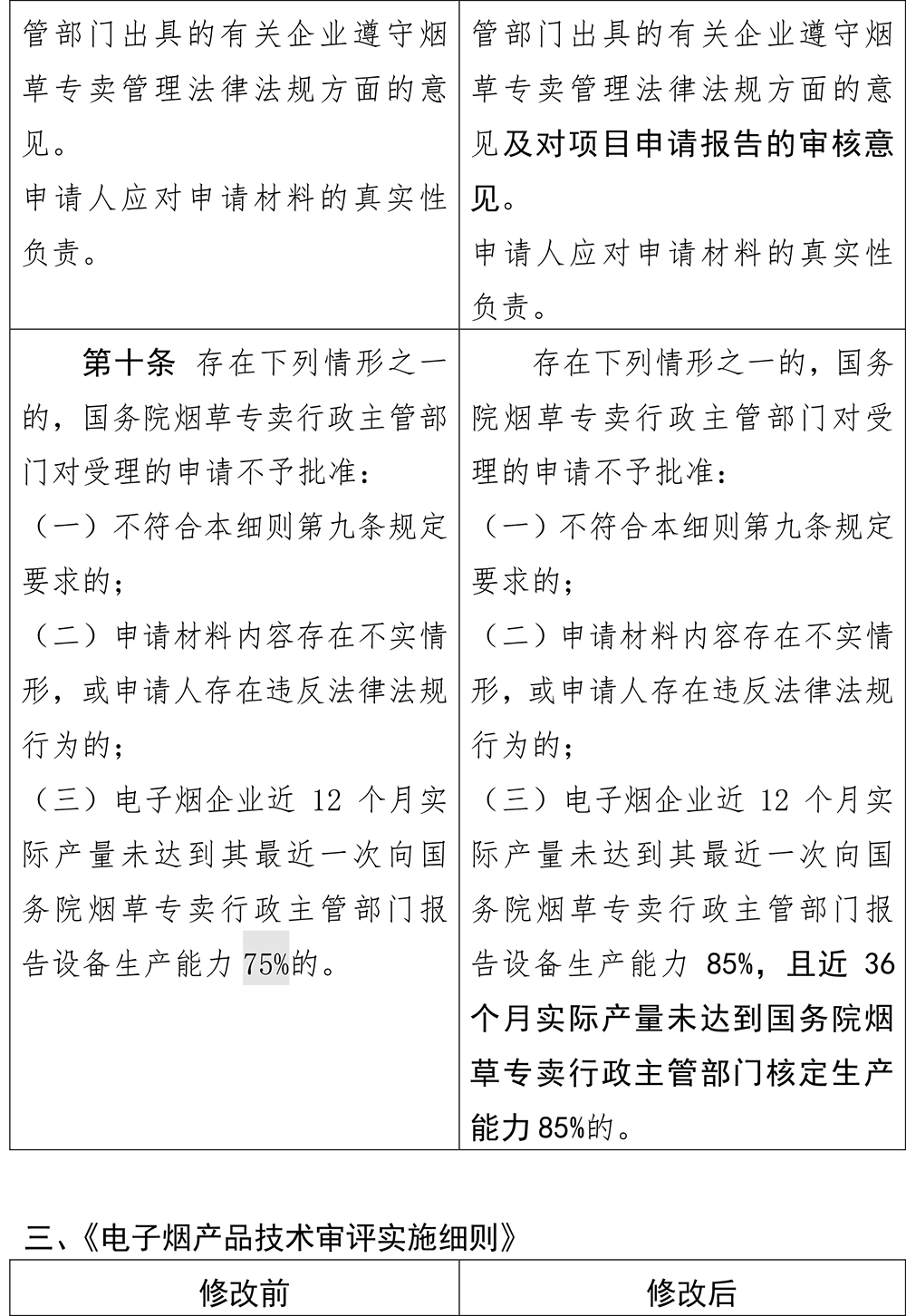 《电子烟固定资产投资管理细则》的修改涉及五处,其中,第十条第三项不予批准情形收紧:电子烟企业近12个月实际产量未达到其最近一次向国务院烟草专卖行政主管部门报告设备生产能力85%,且近36个月实际产量未达到国务院烟草专卖行政主管部门核定生产能力85%的。国务院烟草专卖行政主管部门对受理的申请不予批准。