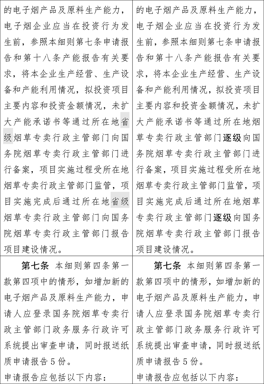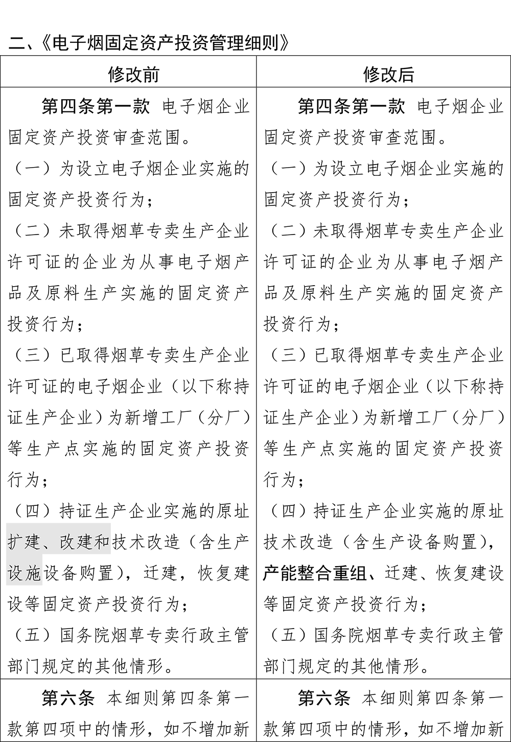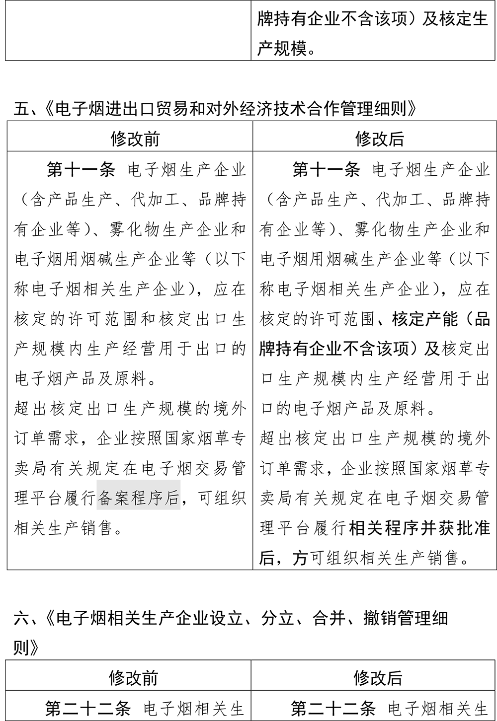 《电子烟进出口贸易和对外经济技术合作管理细则》修改了一处,修改后的第十条,是要求电子烟生产企业(含产品生产、代加工、品牌持有企业等)、雾化物生产企业和电子烟用烟碱生产企业等(以下称电子烟相关生产企业),应在核定的许可范围、核定产能(品牌持有企业不含该项)及核定出口生产规模内生产经营用于出口的电子烟产品及原料。超出核定出口生产规模的境外订单需求,企业按照国家烟草专卖局有关规定在电子烟交易管理平台履行相关程序并获批准后,方可组织相关生产销售。