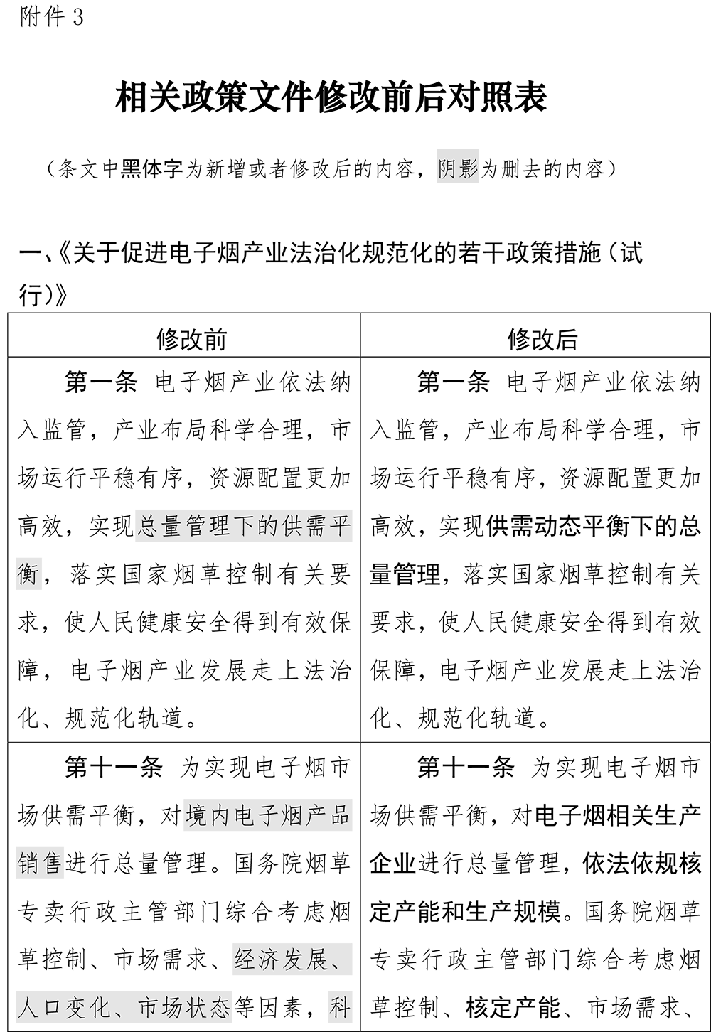其中,在对《关于促进电子烟产业法治化规范化的若干政策措施(试行)》(国烟办〔2022〕43号)作出的修改共计三条,其中将第一条修改为“电子烟产业依法纳入监管,产业布局科学合理,市场运行平稳有序,资源配置更加高效,实现供需动态平衡下的总量管理。”修改之前的表述则是“实现总量管理下的供需平衡”。