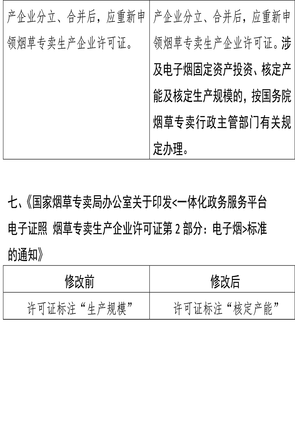 此外,《电子烟相关生产企业设立、分立、合并、撤销管理细则》第二十二条,新增“电子烟相关生产企业分立、合并后,涉及电子烟固定资产投资、核定产能及核定生产规模的,按国务院烟草专卖行政主管部门有关规定办理”。《国家烟草专卖局办公室关于印发标准的通知》则是要求将许可证标注“生产规模”修改为标注“核定产能”。