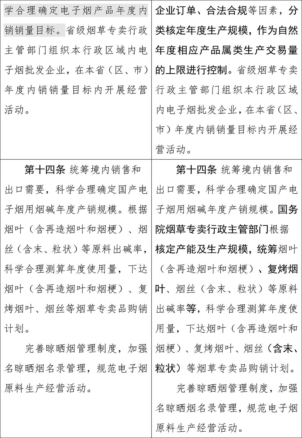 在该条修改之前,只是“对境内电子烟产品销售进行总量管理”,且进行总量控制的综合考虑因素包括“经济发展、人口变化、市场状态”,修改后删除这三个考虑因素,但新增“核定产能、企业订单、合法合规”因素,并要分类核定年度生产规模,作为自然年度相应产品属类生产交易量的上限进行控制。